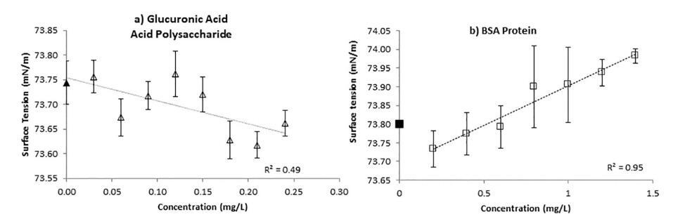 圖 5.a) 葡糖醛酸,一種酸性多糖,證明在低濃度下 SFT 降低。 b) 相反,BSA 蛋白在低 專注。 然而,BSA 在較高濃度下再次降低。 低濃度下 SFT 的這種增加可以通過(guò)水中 pH 值的降低來(lái)解釋 由 BSA 引起,圖 6。