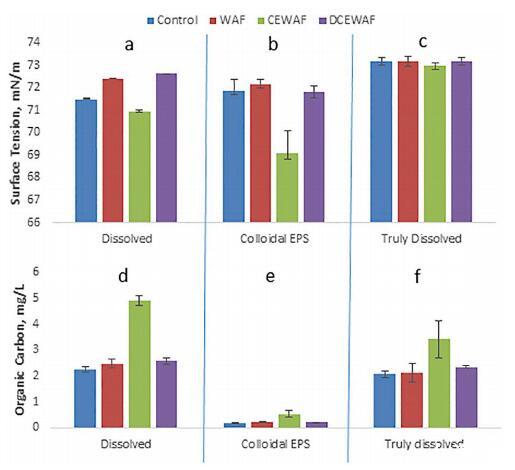 圖 2 中的有機(jī)碳表明大部分溶解的 部分,圖 2d,由低分子量碳組成,因?yàn)榭側(cè)芙獠糠郑瑘D 2f,幾乎等于 有機(jī)碳濃度中的溶解分?jǐn)?shù)。 膠體 餾分(圖 2e)表明超濾已去除了 85% 到 95% 的 溶解部分的有機(jī)碳。 這可能表明 5% 到 15% 的 CEWAF 可能保留在 EPS 膠體部分中, 表明 SFT 的降低(圖 2b)也受 Corexit 的影響 和 WAF。 然而,使用 SFT 與 Corexit 濃度數(shù)據(jù), 圖 4b,即使是 15% 的 Corexit 也無(wú)法解釋 在圖 1 的 CEWAF 處理中測(cè)量的 SFT 降低。