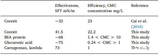表 2 SFT 和 CMC 比較模型蛋白質(zhì)和酸性多糖。 雖然Corexit 更有效地降低 SFT,EPS 模型成分更有效 因?yàn)樾枰偷枚嗟臐舛炔拍荛_(kāi)始乳化(蛋白質(zhì))和 穩(wěn)定成分(酸性多糖;結(jié)合大分子并添加 粘度)。