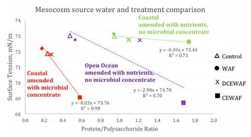 EPS 膠體溶液的 SFT 與 蛋白質(zhì)(更疏水)到多糖(更親水) 集中度,可以作為整體的相對(duì)度量 膠體部分的疏水性。 此外,圖1中的數(shù)據(jù) 意味著石油和/或 Corexit 的存在導(dǎo)致增強(qiáng) EPS 膠體的蛋白質(zhì):多糖比率,但降低了 膠體部分的 SFT。 CEWAF 中蛋白質(zhì)含量較高 處理對(duì)應(yīng)的細(xì)菌計(jì)數(shù)高于其他處理 治療(Kamalanathan 等人,2018 年;Doyle 等人,2018 年)。 DCEWAF 還具有更高的蛋白質(zhì)含量和更高的蛋白質(zhì):多糖 比 WAF 和對(duì)照處理。 值得注意的是,當(dāng) 與不同的中宇宙實(shí)驗(yàn)相比,開(kāi)闊的海洋中宇宙的油濃度高兩倍,相對(duì) DCEWAF 處理中的 Corexit 含量較高,即它們僅 ~6.3 倍稀釋的 CEWAF,而 DCEWAF 處理來(lái)自 用微生物濃縮物修正的沿海水域約 15 倍 稀釋的 CEWAF 和經(jīng)過(guò)修正的營(yíng)養(yǎng)物質(zhì)的沿海水域是 ~ 10 倍稀釋的 DCEWAF(表 1)。 因此,趨勢(shì)線的斜率 可能受到 DCEWAF 中 Corexit 數(shù)量的影響,并且 CEWAF 處理 SFT 和蛋白質(zhì):多糖 比率。 由于其表面活性劑特性,Corexit 降低了 SFT,但它 還增強(qiáng)了蛋白質(zhì)的產(chǎn)生,導(dǎo)致比對(duì)照和 WAF 處理更高的蛋白質(zhì):多糖比率。 這 相對(duì) SFT 和蛋白質(zhì):對(duì)照和 WAF 的多糖位置 可能是由膠體和海水的組成和濃度的微小差異產(chǎn)生的。