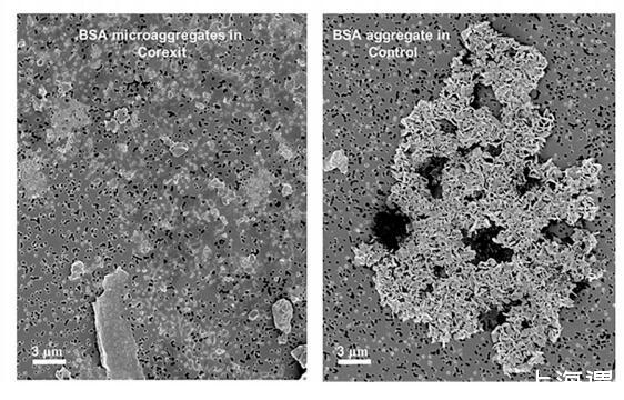 相同放大倍數(shù)下 BSA 聚集體的 SEM 圖像(圖 3b) 在 Corexit(左)和 ASW 中用 0.1% BSA 溶液制備 來(lái)自與圖 3a 中相同的溶液的對(duì)照處理(右)。 這 Corexit 處理(左圖 3b)顯示來(lái)自液體的微聚集體 階段。 對(duì)照處理(圖 3b 右)顯示了一個(gè)大結(jié)晶 蛋白質(zhì)聚集體。 圖 3a 和 3b 中描繪的結(jié)果支持 靜電相互作用和共價(jià)鍵作用的重要性 在微聚集體形成中(Corexit 與 Ca2+ 離子突出顯示 CTC) 和 Ca2+ 螯合中的配位共價(jià)鍵 CTC 和陰離子親水部分(CEWAF、WAF 和對(duì)照 處理)形成比 Corexit 更少但更大的聚集體 治療。