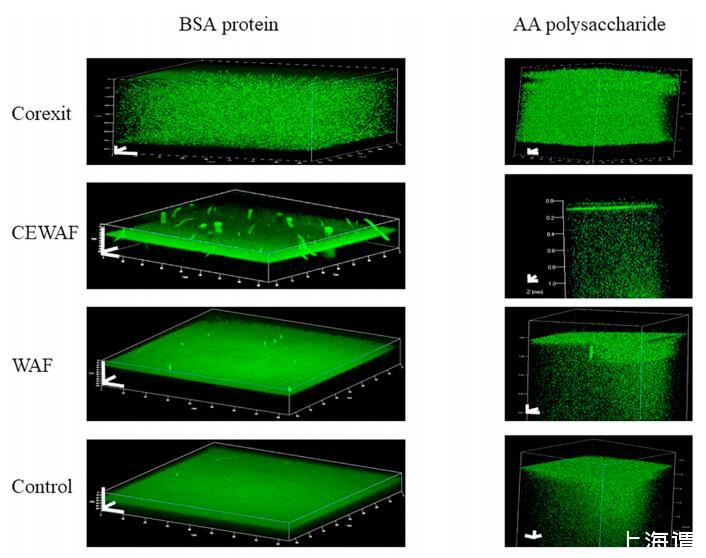 四種治療的共聚焦激光掃描顯微鏡 (CLSM) 帶有模型 EPS 組件的處理如圖 3 所示。 ASW 顯示在左側(cè) BSA 的 0.1% 垂直系列溶液中 右邊是一系列 0.1% 的海藻酸溶液。 橫向, 面板顯示了 Corexit、CEWAF、WAF 的相應(yīng)處理, 和對(duì)照,用于 BSA 和海藻酸溶液。 綠色熒光探針 CTC 突出顯示與陰離子結(jié)合的親水性 Ca2+ 多糖和蛋白質(zhì)的區(qū)域。 對(duì)于海藻酸和 BSA實(shí)驗(yàn),單獨(dú)使用Corexit就可以分散模型分子 無(wú)界面積聚。 圖像也顯示出明亮密集 微聚集體中較高傾向的綠色熒光 Corexit 比在其他治療中看到的要多。 海藻酸面板全部顯示 聚集體的分散,而 BSA 面板顯示主要在界面處的蛋白質(zhì)。 CEWAF 海藻酸和 BSA 可以生成 清晰的界面層。 CEWAF 中的 BSA 顯示聚合 當(dāng)它們向上擴(kuò)散時(shí)在垂直方向上被夸大 隨著圖像曝光的時(shí)間。 此外,BSA CEWAF 顯示聚集體似乎在液體表面上方,因?yàn)樗鼈兪?在未顯示的泡沫層之內(nèi)和之上。 具有主要親水部分的控制處理表現(xiàn)出較少的分散 和不太明顯的界面層。 雖然垂直尺度較小 對(duì)于 BSA 圖像比對(duì)于海藻酸圖像,仍然很明顯 海藻酸分散在整個(gè)體積中,而 BSA 迅速擴(kuò)散到界面。 唯一的例外是 Corexit 處理顯示沒(méi)有界面積聚和完全分散 海藻酸和BSA。