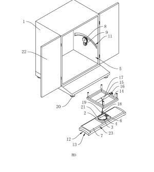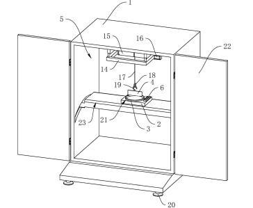 參照圖1,包括殼體1、工作臺2、盛液盒3和標(biāo)準(zhǔn)板4,殼體1內(nèi)設(shè)置有工作腔5,殼體1底部設(shè)置有多個支撐腳20,在本申請實(shí)施例中,支撐腳20設(shè)置為四個,四個支撐腳20設(shè)置于殼體1的四角位置;殼體1上鉸接有兩轉(zhuǎn)動門22;工作臺2設(shè)置于工作腔5內(nèi),工作臺2上開設(shè)有與盛液盒3適配的放置槽21,盛液盒3可放置于放置槽21中,標(biāo)準(zhǔn)板4設(shè)置于盛液盒3上方,標(biāo)準(zhǔn)板4通過升降結(jié)構(gòu)可升降連接于殼體1上,工作臺2上固定連接有水平儀6,在本申請實(shí)施例中水平儀6選用氣泡式水平儀,也可選擇其他體積較小的水平儀;工作臺2和殼體1之間設(shè)置有用于調(diào)平工作臺2的調(diào)平結(jié)構(gòu)。