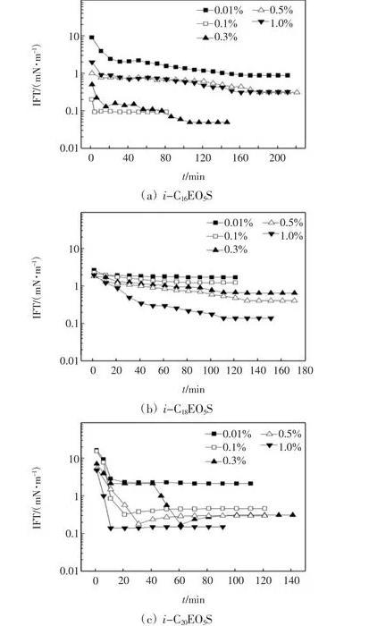 (1)本文研究的3種支鏈化脂肪醇聚氧乙烯醚磺酸鹽具有一定的降低界面張力活性,界面張力可達(dá)10-2mN/m數(shù)量級。