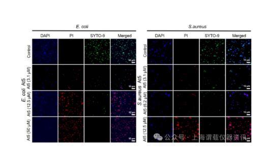 圖5、大腸桿菌和金黃色葡萄球菌在37°C下用不同濃度的At5肽處理2小時(shí)前后的活/死染色(×100放大倍數(shù),比例尺=10μm)。