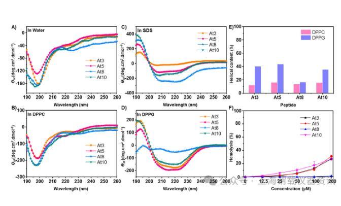 圖2、設(shè)計(jì)肽的二級(jí)結(jié)構(gòu)和溶血特性。(A)水、(B)25 mM SDS、(C)兩性離子DPPC SUV(0.25 mg mL-1)和(D)帶負(fù)電荷的DPPG SUV(0.25 mg mL-1)中肽的CD光譜。所有四種肽(At3、At5、At8、At10)在水和DPPC SUV中均呈現(xiàn)無(wú)規(guī)卷曲結(jié)構(gòu),而在SDS和DPPG SUV中均采用螺旋結(jié)構(gòu)。肽濃度固定在0.1 mM。所有測(cè)量均在室溫下進(jìn)行。(E)DPPC和DPPG SUV中肽的α-螺旋含量。(F)肽的溶血活性。用不同濃度的肽處理人紅細(xì)胞(hRBC)并在37°C下孵育1小時(shí)。然后在OD540nm處測(cè)量吸光度。