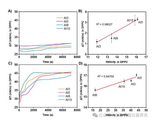 圖4、(A和C)在亞相中注射抗菌肽后DPPC和DPPG脂質(zhì)單層的表面壓力變化。(B和D)分別在注射抗菌肽(AMP)后DPPC和DPPG脂質(zhì)單層表面壓力的增加與DPPC和DPPG中AMP的螺旋度之間的相關(guān)性。注射抗菌肽后兩性離子DPPC脂質(zhì)單層表面壓力的增加非常小,而陰離子DPPG脂質(zhì)單層表面壓力的增加相當(dāng)高。