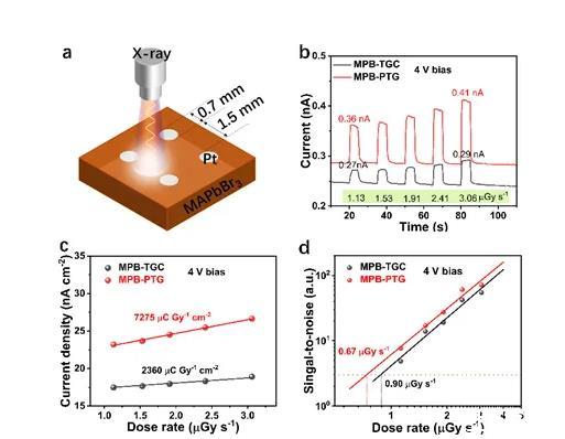 圖4.MAPbBr3單晶探測器的x射線探測器。(a)結(jié)構(gòu)圖;(b)光電流響應(yīng);(c)靈敏度;(d)探測極限。