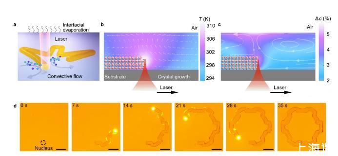 研究者利用COMSOL模擬了激光照射下鈣鈦礦晶體周圍的局域過飽和度,并通過實(shí)驗(yàn)驗(yàn)證了過飽和度產(chǎn)生的原理。其中馬倫格尼對流的引入加速了傳質(zhì)過程,使得鈣鈦礦結(jié)構(gòu)能夠在激光誘導(dǎo)下快速生長,在實(shí)驗(yàn)中,MAPbBr3鈣鈦礦單晶的生長速度可達(dá)0.1 mm/s,顯著快于傳統(tǒng)的鈣鈦礦單晶制備方法。激光閾值功率約為150μW,低于現(xiàn)有的激光調(diào)控鈣鈦礦結(jié)晶過程方法。