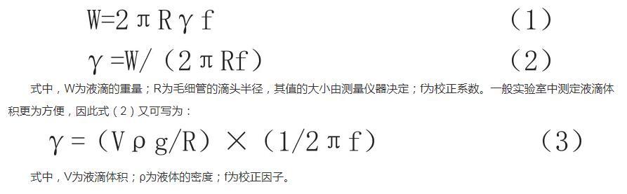 滴體積法的基本原理是這樣的,利用毛細管滴頭,緩慢往下滴液體,這時候測量液滴的大小,就能測定液體的表面張力。這是因為液體的表面張力,與從毛細管滴下的液滴的大小有內在關聯(lián),存在正比關系,這個關系可以用數(shù)學公式表達: