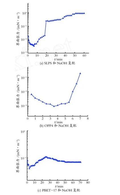 堿與表面活性劑復(fù)配有一定的協(xié)同效應(yīng),但使用高濃度堿容易引起結(jié)垢等問(wèn)題,實(shí)驗(yàn)選用低濃度的NaOH(質(zhì)量分?jǐn)?shù)為0.1%)與SLPS、OPP-4和PBET-17進(jìn)行了復(fù)配,測(cè)定了其油-水動(dòng)態(tài)界面張力,如圖2所示。