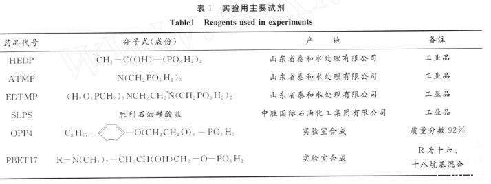 在化學(xué)驅(qū)提高采收率方法中,表面活性劑/堿復(fù)合驅(qū)的驅(qū)油效果比較好,這主要是由于堿與原油中酸性物質(zhì)反應(yīng)生成的活性劑與外加表面活性劑產(chǎn)生了協(xié)同效應(yīng),可以將油水界面張力降至低界面張力區(qū)域(10-2m N/m)甚至超低界面張力區(qū)域(10-3m N/m),并且堿可以降低活性劑在地層中的吸附。但在高堿濃度下,注入堿容易對(duì)驅(qū)油體系造成采出液處理困難、引起地層黏土分散和運(yùn)移、導(dǎo)致地層滲透率下降等負(fù)面作用,并且堿也與油層流體及巖石礦物反應(yīng),形成堿垢,對(duì)地層造成傷害并影響油井正常生產(chǎn)。解決結(jié)垢問(wèn)題的主要方法是加入化學(xué)防垢劑,其中有機(jī)膦酸鹽防垢劑因其良好的防垢效果而有廣泛的應(yīng)用。