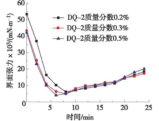 測(cè)定低界面張力表面活性劑DQ-2體系的質(zhì)量分?jǐn)?shù)分別為0.2%,0.3%,0.5%的油水界面張力,不同濃度目標(biāo)體系的油水界面張力隨時(shí)間變化曲線見(jiàn)圖1。