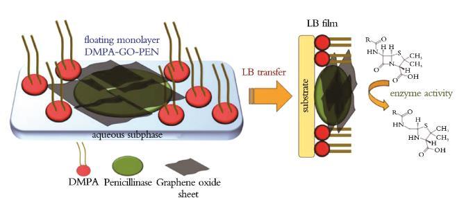 此外,將經(jīng)典兩親分子的Langmuir單層與酶結合是保持生物大分子催化性能的一種方式。F.A.SCHLL等研究了磷脂LB膜固定化青霉素酶(PEN),將GO加入青霉素酶‐脂質Langmuir單層膜中,并作為LB膜轉移到固體載體上,評估了酶的催化性能(見圖3)。結果表明,GO作為由2,2‐二羥甲基丙酸(DMPA)和PEN組成的LB膜的添加劑,被固定在LB膜的PEN中;GO存在于酶脂LB膜中,不僅可以調節(jié)青霉素酶的催化活性,而且有助于數(shù)周后仍保持其酶活性。研究結果加強了混合納米結構薄膜的重要性,證明了使用由脂質、GO和酶組成的LB膜應用于光學生物傳感器的可行性,對應用傳感器的生物電子設備研究具有重要意義。