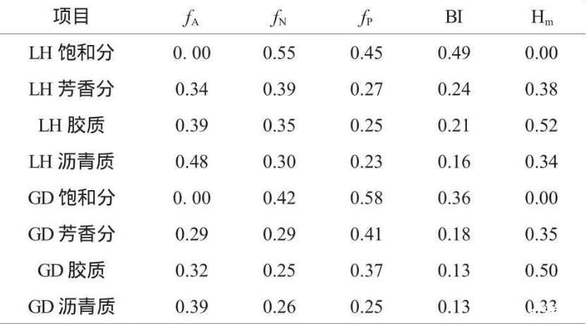 可以看出,隨著組分的增重,兩種稠油組分系類列的fA逐漸變大,fN、fP、BI逐漸變小。兩個(gè)系列的不同在于,遼河稠油組分的fA、fN和BI均大于孤島稠油組分,即芳香碳率、環(huán)烷碳率、烷鏈支化度較高。因此,遼河稠油組分中共軛成分含量大于孤島稠油組分。