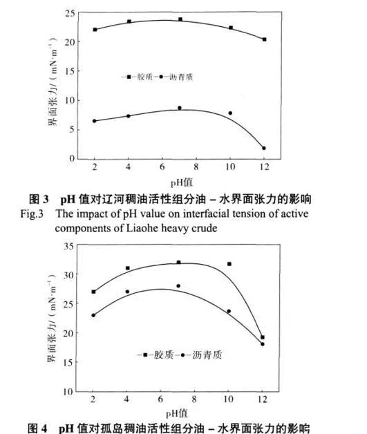 在同一系列組分中,膠質(zhì)的硫、氧、氮含量低,酸性基團(tuán)少,但芳香共扼結(jié)構(gòu)也少,酸性基團(tuán)參與反應(yīng)的機(jī)率相對要高,而瀝青質(zhì)硫、氧、氮含量高,酸性基團(tuán)多,但芳香共扼結(jié)構(gòu)多,空間阻滯作用強(qiáng),酸性基團(tuán)參與反應(yīng)的機(jī)率相對要低,總體上表現(xiàn)為pH值對瀝青質(zhì)的油-水界面張力的影響大于對膠質(zhì)的影響。