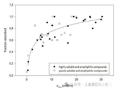 本論文研究人員提出了一種藥物活性分子生物利用度(fa)快速篩選方法-表面活性譜(SAP),作為替代傳統(tǒng)的動物研究和細(xì)胞培養(yǎng)篩選。研究人員使用SAP技術(shù),主要是基于Kibron公司的高通量表面張力分析儀----(Delta-8),該儀器只需要50ul原液就能進(jìn)行完整的滲透率分析。并將溶液中化合物的表面活性譜化合物與生物膜相互作用或穿透生物膜的潛力聯(lián)系起來。用于這種關(guān)聯(lián)的進(jìn)一步參數(shù)包括臨界膠束濃度(CMC)、界面空氣/水分配系數(shù)(KAW?1)和分子在界面的面積要求,即截面面積(AS)等這些表面活性參數(shù)來獲取藥物的生物利用度(fa值)。此方法的提出對于先導(dǎo)化合物的早期篩選研究,因?yàn)橄葘?dǎo)化合物只有少量的化合物可用,SAP方法似乎是一個很有效和快速的工具,可以準(zhǔn)確預(yù)測兩親性化合物的fa值,為新藥研發(fā)提供了重要的技術(shù)支持,這也說明高通量的表面張力分析儀(delta-8)在藥物研發(fā)方面發(fā)揮了重要的作用,尤其是預(yù)測活性藥物分子的生物利用度(fa)提供了一種新的技術(shù)手段。