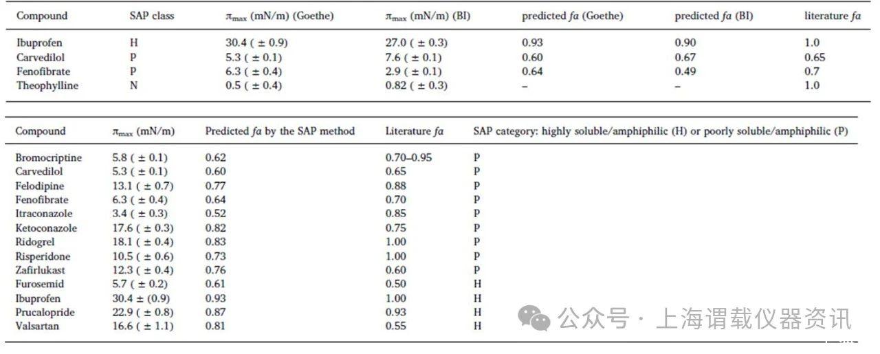 在LCs(先導(dǎo)藥物)的早期研究中,只有少量的化合物可用,如果化合物是兩親性的,SAP方法似乎是獲得fa的一個有效且快速的工具。只需要少量的LC原液的解決方案(50μl)通過Delta-8儀器進(jìn)行分析,而沒有采用進(jìn)一步分析如高效液相色譜法分析,高效液相色譜法盡管其簡單,能夠預(yù)測廣泛化合物的藥物的生物利用度(fa),包括高溶性和低溶性的兩親性化合物。而對于難溶性和高溶性兩親性化合物,改進(jìn)的SAP(表面活性譜法)預(yù)測fa值與文獻(xiàn)報道的藥物分子的fa值相近。但是此方法不適合預(yù)測非兩親性藥物的fa值。
