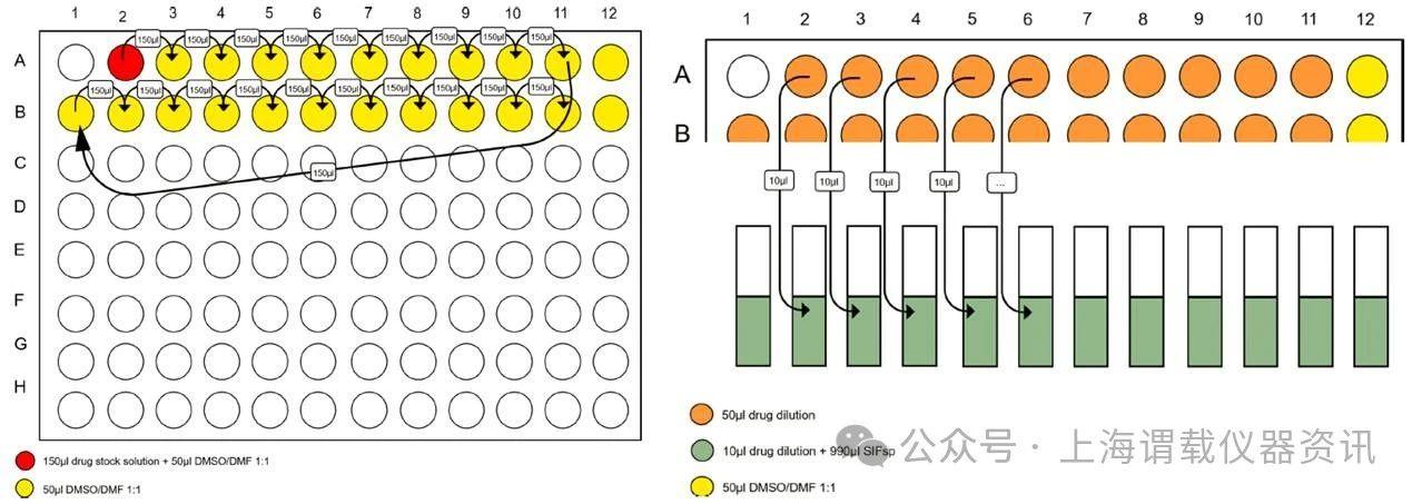 圖2、左邊的圖表示的是采用移液槍將樣品(難溶性的兩親化合物)轉(zhuǎn)移到kirbon公司的96孔板上測試其表面張力。右圖表示的是采用了改進(jìn)的制備難溶性的兩親性化合物的表面張力的方法。