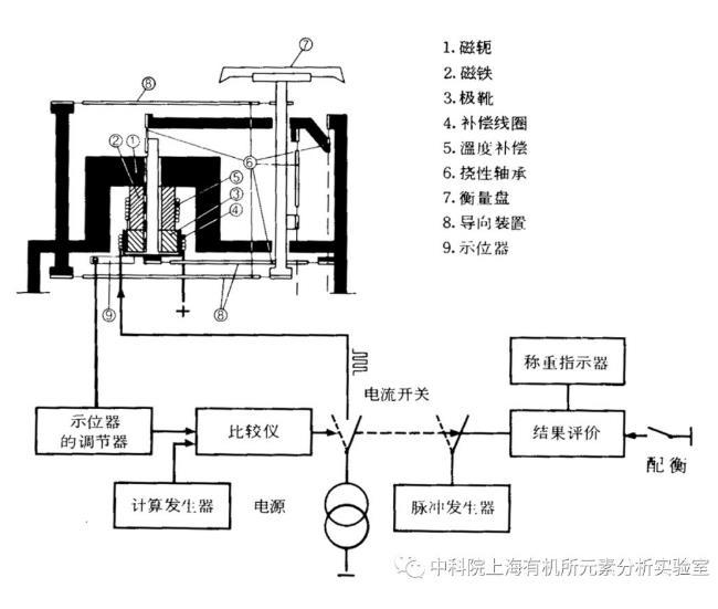 電子天平的結(jié)構(gòu)原理如上圖所示。包括衡量盤(pán)在內(nèi)的載荷接收裝置由兩對(duì)三角形導(dǎo)向裝置控制,衡量盤(pán)只能進(jìn)行垂直運(yùn)動(dòng)。磁鐵裝置由永久磁鐵組成,磁軛和極靴連接在載荷接收裝置的最下端,補(bǔ)償線圈放在磁鐵裝置的空氣間隙中。如果電流流往線圈,線圈中就產(chǎn)生直接向上的力,這種力作用于衡量盤(pán)上的重力。光電掃描裝置使這種力能辨別載荷接收裝置預(yù)先規(guī)定的中心位置。如果載荷有變位,調(diào)節(jié)器及其放大器就改變流經(jīng)線圈的電流,直到回到中心位置為止。在小載荷的情況下,電流通過(guò)時(shí)間短,載荷大時(shí)電流停留的時(shí)間長(zhǎng)。通電流的時(shí)間間隔是通過(guò)平衡位置掃描的可變?cè)鲆娣糯笃鱽?lái)調(diào)節(jié)的,而且這種時(shí)間間隔直接與載荷成正比。這樣,當(dāng)用加載的方式接通電流時(shí),就用計(jì)算器計(jì)算脈沖。當(dāng)測(cè)量結(jié)束時(shí),計(jì)算器指示其結(jié)果。概況來(lái)說(shuō),電磁力平衡式電子分析天平是把待測(cè)物的質(zhì)量通過(guò)電磁力平衡原理變換為電流檢測(cè),再經(jīng)電流/電壓變換、模/數(shù)轉(zhuǎn)換和數(shù)字化運(yùn)算處理,用數(shù)字顯示待測(cè)物的質(zhì)量值。