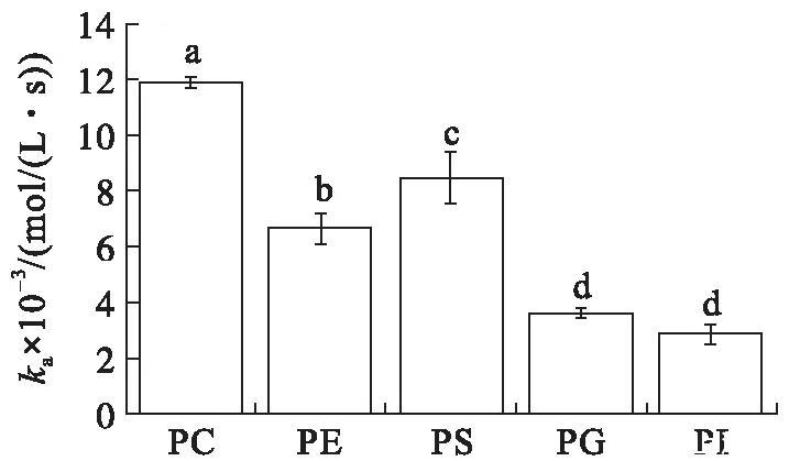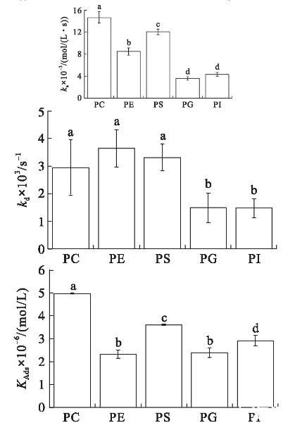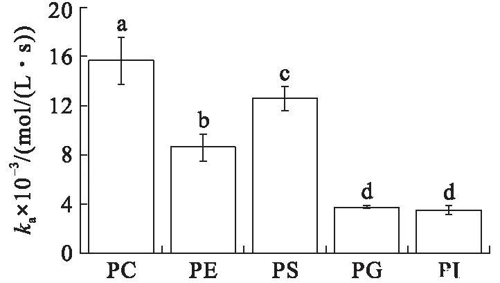 在初始表面壓力為25 mN/m的條件下(見圖4),VhPLD對(duì)PC的吸附常數(shù)最大((1.46±0.10)×104mol/(L·s)),對(duì)于PG((3.58±0.31)×103mol/(L·s))和PI((4.30±0.34)×103mol/(L·s))的吸附常數(shù)最小。在該初始表面壓力條件下,VhPLD對(duì)于PC、PE和PS的解離常數(shù)之間不存在顯著差異(P>0.05),該結(jié)果與在15 mN/m所測(cè)定的結(jié)果保持一致。而在該條件下獲得的VhPLD對(duì)不同磷脂單分子層吸附偏好性順序?yàn)镻C>PS>PI>PE=PG。