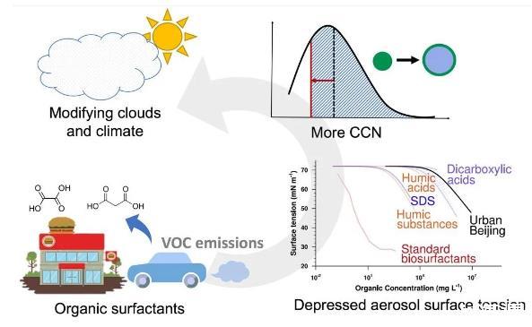 研究進一步表明,忽略表面張力降低效應(yīng)將導(dǎo)致在云中典型過飽和度范圍內(nèi)(0.23%-0.76%)超細云凝結(jié)核(直徑<100 nm)的數(shù)濃度降低6.8%-42.1%。綜上所述,本研究提供了有機物降低城市氣溶膠表面張力的新證據(jù),表面張力的降低將增加云凝結(jié)核的數(shù)量,從而影響云和氣候(圖3)。