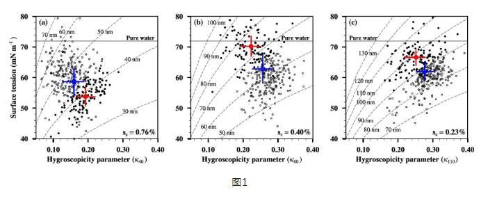 大氣氣溶膠作為云凝結(jié)核,通過與云的相互作用對氣候產(chǎn)生影響。氣溶膠活化為云滴,除了取決于氣溶膠的粒徑大小、化學(xué)成分和混合狀態(tài),更進一步地,與氣溶膠的表面張力息息相關(guān)。大氣氣溶膠和云滴中廣泛存在著具有表面活性的有機物,它們可以減小氣溶膠活化時的表面張力,降低粒子增長的能量壁壘,使氣溶膠更容易被活化為云滴,從而增加云滴數(shù)濃度。本次研究結(jié)果表明:有機物顯著降低了污染大氣中氣溶膠的表面張力。
