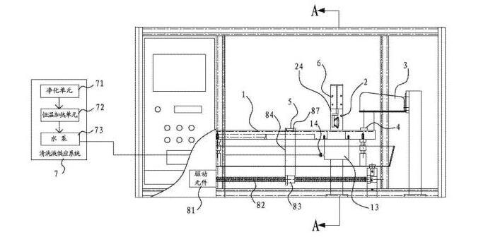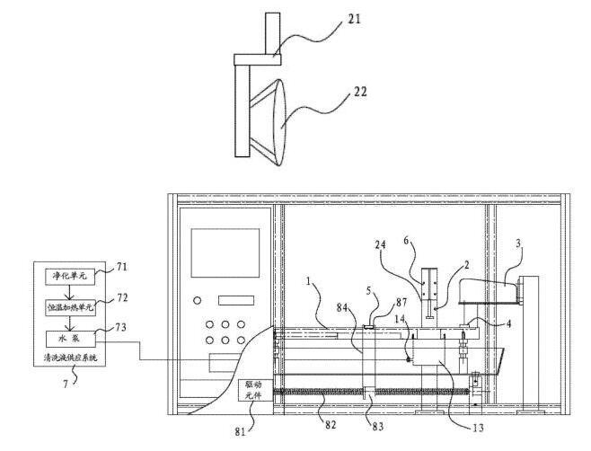 [0018]在一些實(shí)施方式中,還包括清洗液供應(yīng)系統(tǒng),清洗液供應(yīng)系統(tǒng)包括凈化單元、恒溫加熱單元和泵體。清洗液通過凈化單元凈化并通過恒溫加熱單元進(jìn)行加熱后,再經(jīng)由泵體供應(yīng)到清洗槽當(dāng)中。其有益效果是,先通過凈化單元,可以預(yù)先清除掉清洗液當(dāng)中可能存在的油。另外,通過恒溫加熱單元可以將清洗液加熱到一定的溫度。因為溫?zé)釥顟B(tài)的清洗液,可以實(shí)現(xiàn)更加的油脂清除能力,從而可以將樣品上的油更方便且更完全的清洗下來。
