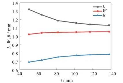 圖7為數(shù)值仿真過程中液滴三軸隨時(shí)間演化規(guī)律。綜合對(duì)比圖4和圖7,數(shù)值仿真軟件與實(shí)驗(yàn)過程中球形液滴的三軸長(zhǎng)度變化趨勢(shì)基本一致。可以看出,在體積保持不變的假設(shè)下,球形液滴的第二半軸和第三半軸變形頻帶是不一致的。該結(jié)果表明一些黏彈性液滴的變形和收縮不嚴(yán)格符合仿射變形假設(shè)(即第三半軸W始終等于第二半軸B),這與文獻(xiàn)結(jié)果類似。數(shù)值仿真結(jié)果中液滴最終形態(tài)不是一個(gè)三軸長(zhǎng)度相等的球形,主要原因是仿真過程中使用的非牛頓流體的本構(gòu)模型只對(duì)黏性項(xiàng)進(jìn)行了修改,而忽視了彈性應(yīng)力的影響,因此與理論計(jì)算結(jié)果有一定誤差。
