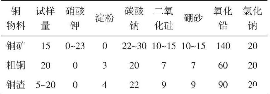 配料前可根據(jù)待測物組分確定熔渣的硅酸度,然后計算各熔劑的需要量。同時根據(jù)試樣還原力試驗結(jié)果(或理論計算試樣的還原力)調(diào)整氧化劑或還原劑加入量。通過優(yōu)選實驗,推薦含銅物料的配料可按表1進行。