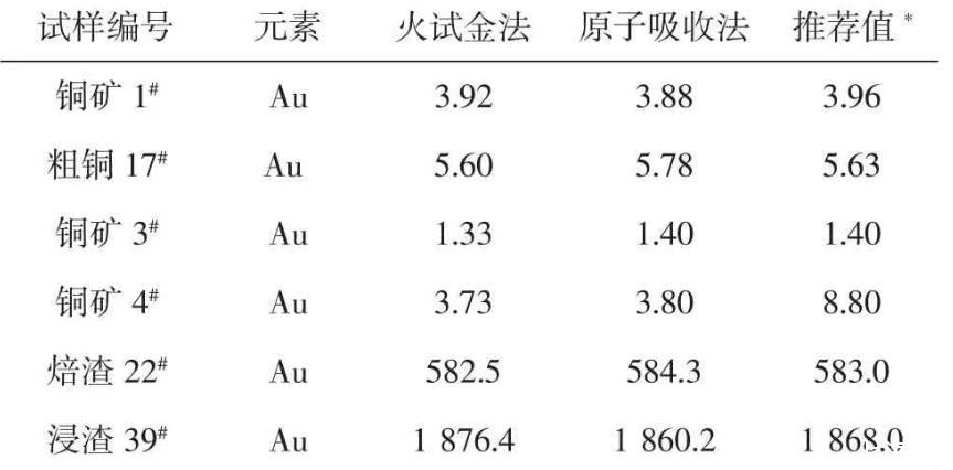 按試驗方法,用不同含量的銅物料樣品進行分析,并與其它測定金元素方法的分析結(jié)果對照,結(jié)果見表5。