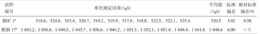 稱取20.00 g樣品,銅礦、銅渣樣直接干法試金配料,按試驗方法進行分析,結(jié)果見表4和表5。