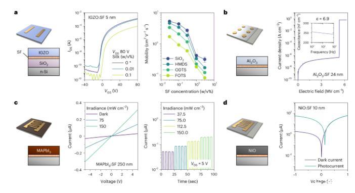 圖4展示了使用SF表面活性劑在憎水表面上制造水基納米器件的過程及其特性。研究發(fā)現(xiàn),SF的自分離特性在不影響器件性能的情況下,保證了薄膜的質(zhì)量和功能。在含有0.03 w/v%SF的IGZO晶體管中,遷移率保持在1至10 cm2/V·s之間,只有在SF濃度超過0.1 w/v%時(shí)才略有下降。即使在疏水性表面上,SF的存在也沒有顯著影響電荷遷移率或引起非理想狀態(tài)(圖4a)。在電介質(zhì)材料中,SF摻雜的Al2O3薄膜顯示出良好的電氣性能(圖4b)。SF還被成功應(yīng)用于制造基于MAPbI3和NiO的光電薄膜,這些薄膜在光照下產(chǎn)生光電流(圖4c,d)。相比商用表面活性劑,SF用量更少且對器件性能影響更小,并具有生物友好性,適用于生物活性傳感器和人機(jī)電子界面等領(lǐng)域,展示了在環(huán)保和經(jīng)濟(jì)效益上的優(yōu)勢。