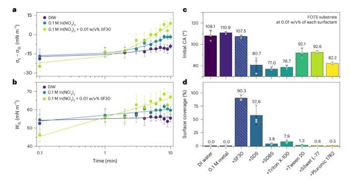 潤濕是液體在固體表面擴(kuò)散以最小化自由能的現(xiàn)象,其效果通過界面張力和粘附功來定量評估。實(shí)驗(yàn)顯示,添加SF30(煮沸30分鐘的絲蛋白)到水溶液中,盡管表面張力與對照組相似,但顯著降低了疏水性基底上的接觸角(CA),表明潤濕增強(qiáng)是由液固界面能的改變引起的,而非溶液表面能的變化(圖2a,b)。SF30通過多嵌段共聚物結(jié)構(gòu)的多樣性有效調(diào)控界面能量,增強(qiáng)了潤濕效果,其水溶液在疏水性表面上的覆蓋率超過90%(圖2d)。與商用表面活性劑相比,SF30在控制疏水表面的潤濕性方面表現(xiàn)更優(yōu),即使這些表面活性劑能有效降低溶液的表面張力(圖2c)。