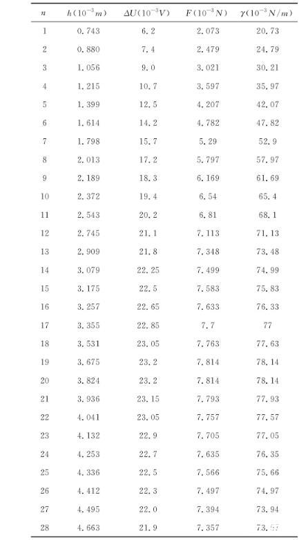 將拉力框置于待測(cè)液體中,調(diào)節(jié)好刀口與液面的平行度。讓液面緩慢上升至與刀口接觸。然后下降液面,形成并拉伸液膜至液膜斷裂。記錄此過程中液面在不同高度(即液膜不同拉伸長(zhǎng)度)時(shí)的位置及此時(shí)力敏傳感器的讀數(shù)U,根據(jù)f=kU,(力敏傳感器的轉(zhuǎn)換系數(shù)k=340.2×10-6N/mV),可計(jì)算出不同高度的受力大小fn。