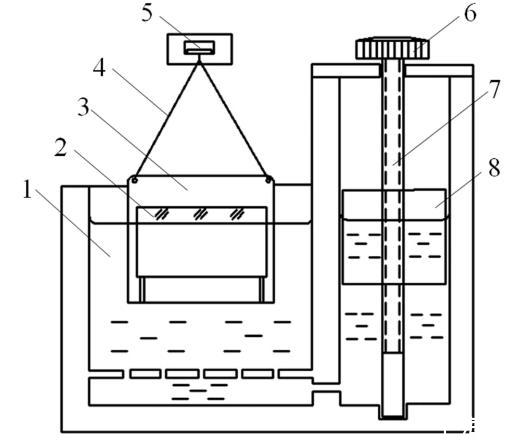 新型表面張力測(cè)試儀基本結(jié)構(gòu)如圖2所示,該儀器盛有液體(1),儀器采用連通器結(jié)構(gòu),截面積較大的左端放置拉力框(3),截面積較小的右端設(shè)有升降塊(8),旋動(dòng)栓鈕(6)和螺桿(7),可使升降塊(8)上升或下降,從而引起液面相應(yīng)的但速度更緩慢的升降。為減小液面升降時(shí)的波動(dòng),容器的兩端通過若干均勻分布的小孔相連通。為便于觀測(cè)液面位置,容器壁采用透明的有機(jī)玻璃材料,通過讀數(shù)顯微鏡確定液面高度。