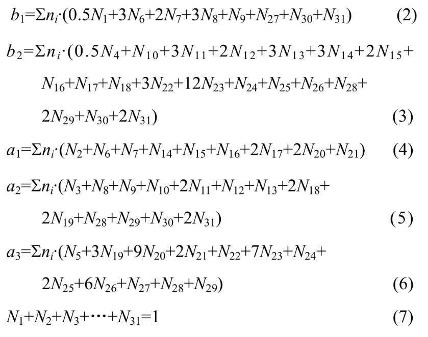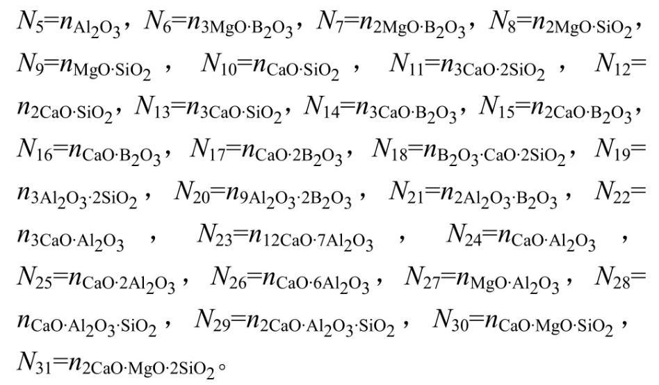 因此,由表1和式(2)~(7)建立計(jì)算MgO-B2O3-SiO2-CaO-Al2O3渣系中結(jié)構(gòu)組元和離子對作用濃度Ni的控制方程,其中N6~N31由N1~N5表示出來。在一定溫度下,熔渣成分代入該方程組,采用迭代法計(jì)算出所有結(jié)構(gòu)組元和離子對的作用濃度。