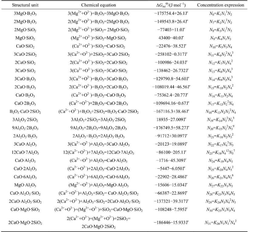 表1 MgO-B2O3-SiO2-CaO-Al2O3渣系中復(fù)雜分子的化學(xué)反應(yīng)及標(biāo)準(zhǔn)Gibbs自由能和作用濃度的表達(dá)式