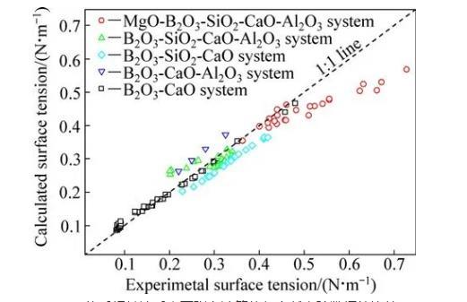 圖1 MgO-B2O3-SiO2-CaO-Al2O3體系相關(guān)渣系表面張力計(jì)算值與文獻(xiàn)實(shí)驗(yàn)數(shù)據(jù)的比較