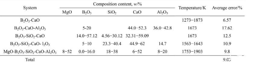表4富硼渣相關(guān)實(shí)驗(yàn)渣系組分、溫度及相對平均誤差