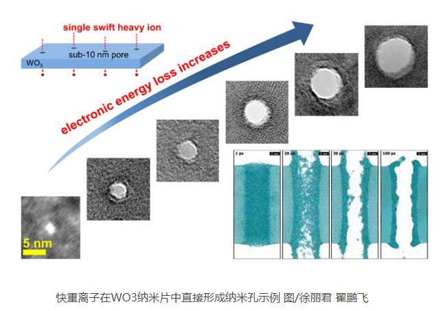 科研人員基于蘭州重離子研究裝置(HIRFL),利用快重離子作用于WO3納米片材料,實現(xiàn)了直接“打孔”的制備方法。同時,科研人員利用分子動力學(xué)模擬對物理機理進行解釋,發(fā)現(xiàn)重離子在材料中的沉積能量會引起材料局域瞬時熔融噴發(fā),以及熔融相的粘度和表面張力大小是決定納米孔形成的關(guān)鍵因素。