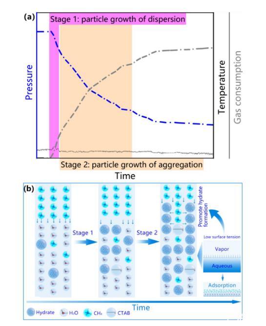 結(jié)合微觀與宏觀尺度的實(shí)驗(yàn)結(jié)果,該研究總結(jié)出兩階段水合物生長(zhǎng)模式——第一階段為顆粒分散生長(zhǎng)過(guò)程、第二階段為顆粒聚集生長(zhǎng)過(guò)程(圖2)。
