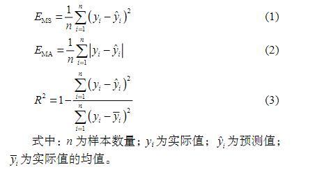 按照8∶2的比例將實(shí)驗(yàn)數(shù)據(jù)劃分為訓(xùn)練集和測試集,對每個模型進(jìn)行訓(xùn)練,并在測試集上進(jìn)行驗(yàn)證。這里選用3種常用于回歸任務(wù)的評價指標(biāo):均方誤差(MSE)、平均絕對誤差(MAE)和決定系數(shù)(2)。MSE和MAE可以衡量預(yù)測值與真實(shí)值之間的誤差,數(shù)值越小表示模型預(yù)測的越準(zhǔn)確;2度量模型擬合數(shù)據(jù)的程度,取值范圍在0到1之間,越接近1表示模型對數(shù)據(jù)的擬合程度越好。這3個評價指標(biāo)的計(jì)算公式如下所示: