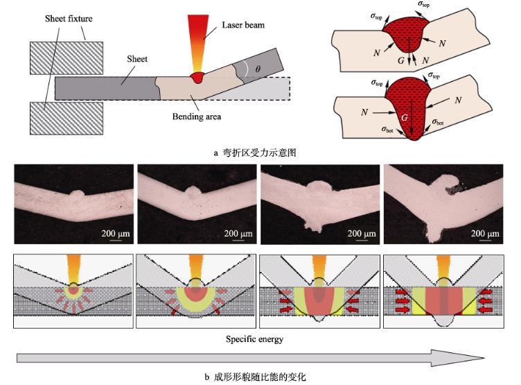 通過觀察激光熱應力成形過程中彎折處的形貌發(fā)現(xiàn),激光熱輸入、彎曲角度和成形機制會影響彎折區(qū)材料表面的擠壓、熔化、流動和凝固過程,以及材料內部的溫度梯度和界面表面張力,這些影響導致彎折區(qū)域的輪廓形貌、粗糙度、顯微組織、硬度分布發(fā)生變化。在激光熱應力成形過程中,熔池的受力情況如圖1a所示。一方面,當比能較小且熔凝區(qū)僅存在金屬板上表面時,薄板彎折處的增厚主要受到左右兩側和下側冷端材料的約束作用,通過作用于上側材料,且上表面局部熔化的材料在頂端表面張力的作用下,形成了頂部凸起的形貌。同時,由于激光瞬態(tài)作用時間較短,熔融材料在激光掃描結束后快速凝固,并在掃描次數(shù)逐漸增加的過程中形成連續(xù)隆起的形貌,在彎折處形貌演變過程中粗糙度逐漸增大。在高比能下,薄板彎折處材料的熔化凝固和塑性變形受到左右兩側材料的橫向約束,該區(qū)域在左右兩側材料的擠壓下增厚。