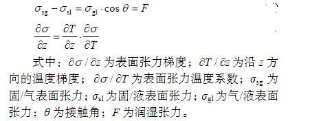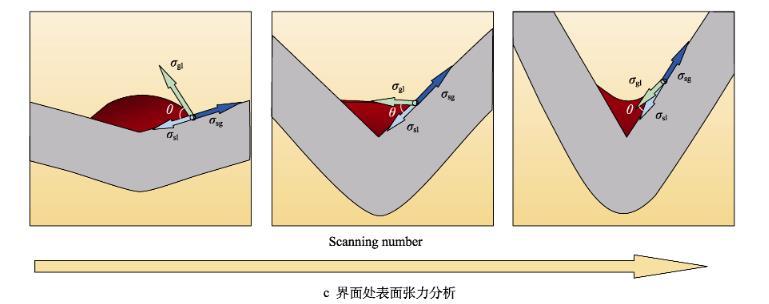 通過對成形過程彎折區(qū)域材料的溫度梯度和界面表面張力進行分析可知,激光熱應力成形界面處的表面張力與潤濕角θ的關系可用楊氏方程表示,見式(1)。在成形結束后,界面表面張力的矢量和為零,同時熔凝層表面張力與溫度梯度存在如式(2)所示的關系。