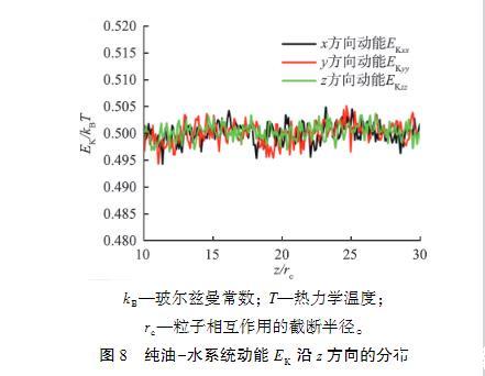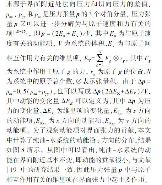 在界面張力的模擬計算公式(5)中,界面張力來源于界面附近處法向壓力和切向壓力的差值,pxx、pyy和pzz是壓力張量p的3個對角分量,壓力張量p又可以進一步分解為與原子速度和力有關(guān)的項,即p=(2EK+EV)/V,其中EK為與原子速度有關(guān)的動能項,V為系統(tǒng)的體積,EV為與原子間相互作用力有關(guān)的維里項,EV=∑Ng=1Fg?rg,其中Fg為系統(tǒng)中作用于原子g的力,rg為原子g的位置,N為系統(tǒng)中的原子總個數(shù),?表示張量積。由于Δp=pzz-0.5(pxx+pyy),也可以寫成Δp(2ΔEK+ΔEV)/V,其中動能的變化量ΔEK可以定義為,其中Δp為壓力的變化量,ΔEV為維里項的變化量,EKzz為z方向的動能項,EKxx為x方向的動能項,EKyy為y方向的動能項。為了觀察動能項對界面張力的貢獻,本文中計算了純油-水系統(tǒng)的動能沿z方向的分布,結(jié)果如圖8所示。從圖中可以看出,純油-水系統(tǒng)的動能在界面附近基本不變,即動能的貢獻很小,與文獻中的研究結(jié)果一致,因此壓力張量p中與原子相互作用有關(guān)的維里項在界面張力中起主要作用。因為壓力張量中的動能項對壓力影響很小。