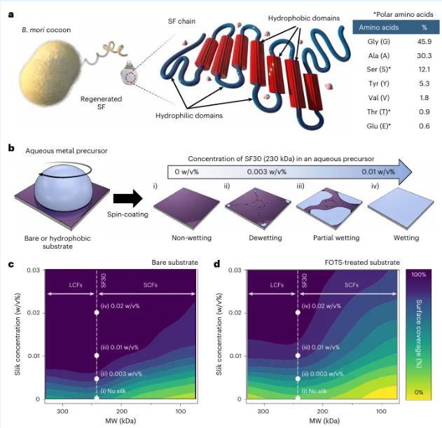 圖1作為天然表面活性劑的SF。b,旋轉(zhuǎn)涂層金屬水合物提高表面覆蓋率的示意圖。金屬水合物溶液的表面覆蓋率的示意圖。c,d,添加了SF的金屬水溶液的表面覆蓋率(%)。的表面覆蓋率(%)?;祝╟)和基底上的表面覆蓋率(%)?;祝╠)上SF添加的金屬水溶液的表面覆蓋率(%)與濃度和分子量的函數(shù)關(guān)系。