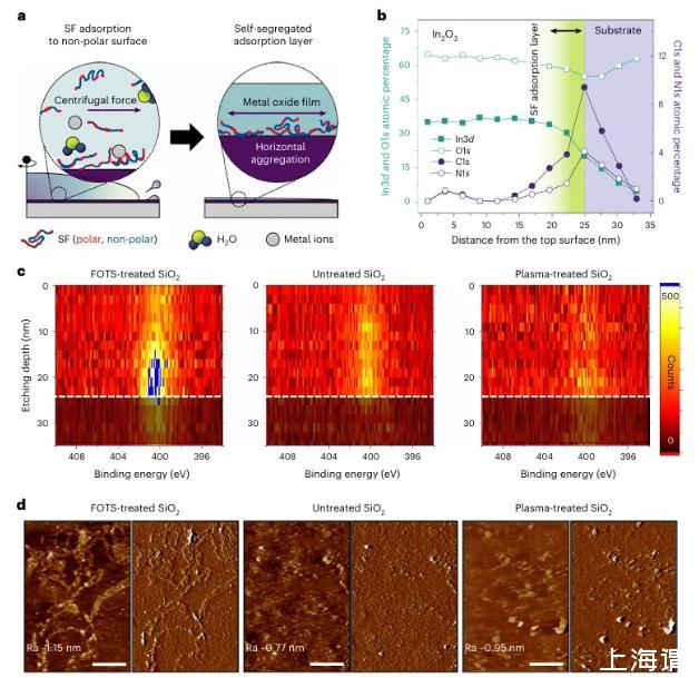 圖3絲綢表面活性劑在薄膜-固體界面的自適應(yīng)吸附。a,表面活性劑在涂覆過(guò)程中的自分離示意圖。b,XPS深度剖面化學(xué)成分分析厚度為25納米的In2 O3薄膜的化學(xué)成分分析。數(shù)據(jù)c,N1s在In2O3薄膜中的N1s分布。SF沉積在具有不同自由表面能的基底上的In2 O3薄膜中的N1s分布。白色虛線線表示與二氧化硅d,通過(guò)選擇性蝕刻金屬氧化物獲得的埋藏SF層的高度和偏轉(zhuǎn)AFM圖,通過(guò)選擇性蝕刻金屬氧化物獲得(比例尺,1μm;Ra,平均值;Ra,算術(shù)平均粗糙度)。