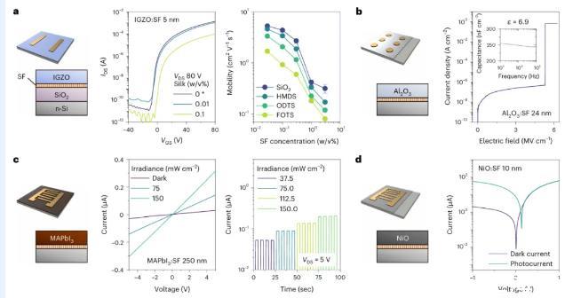 圖4使用絲表面活性劑的水激活納米器件。基于IGZO:SF的場(chǎng)效應(yīng)晶體管(FET)。中間:用不同的晶體管的轉(zhuǎn)移曲線。右圖:不同SF晶體管的電荷遷移率。數(shù)據(jù)點(diǎn)和誤差條顯示平均值±s.d.(樣本數(shù)為3)。以及制備的MAPbI3的薄膜的I-V特性。d,基于NiO:SF的光電探測(cè)器的結(jié)構(gòu)(左)和在不同側(cè)向電壓(中)和時(shí)間(右)下的光探測(cè)器的結(jié)構(gòu)(左)及其在白光照明下的I-V特性(右)。(右圖)。所有器件都是在疏水性基底上制造的SF基絕緣體的結(jié)構(gòu)(左)及其電流密度-電場(chǎng)曲線。