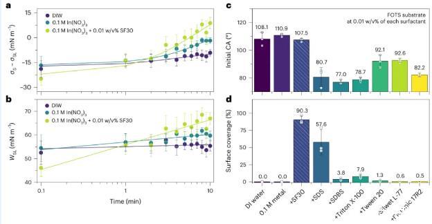 圖2利用絲表面活性劑進(jìn)行高效的界面能控制。水溶液中SF在水溶液中的界面張力(a)和粘附功(b)的隨時(shí)間變化。(d)與其他商用和最先進(jìn)表面活性劑的比較。表面活性劑。在a和b中,數(shù)據(jù)點(diǎn)和誤差條表示平均值±標(biāo)準(zhǔn)偏差(s.d.標(biāo)準(zhǔn)偏差(s.d.)(樣本量為4),直線表示線性回歸。在c和d中,點(diǎn)表示數(shù)據(jù)點(diǎn)。色條和誤差條顯示平均值±標(biāo)準(zhǔn)差(樣本量3)